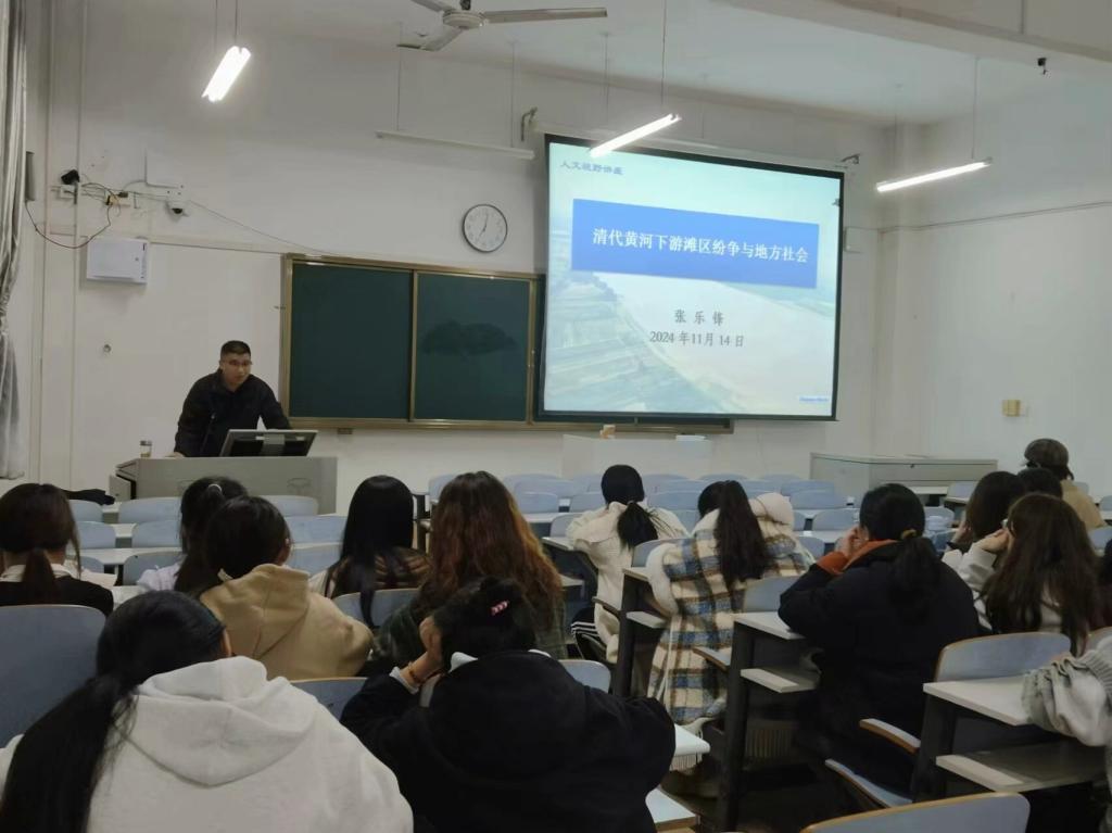 11月14日晚,张乐锋博士在人文楼605教室作了题为“清代黄河下游滩地纷争与地方社会”的学术讲座,2023级历史学同学到场听讲。