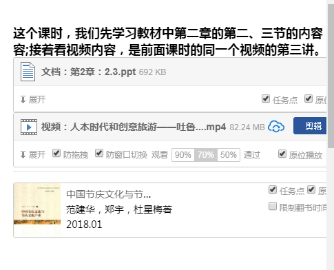 一、精心备课,丰富教学容量。受新冠肺炎疫情影响,网络教学成了隔离期间员工进行学习的有效途径。为了克服网络教学“知识碎片化”的弱点,姚磊从学习资源入手,精心备课。一方面,结合教材和研究资料,按照教学计划,认真准备每个学习单元的课件,通过丰富的课件内容克服员工手上没有纸质教材的学习困难。另一方面,借助学习通、B站、慕课等网络平台,搜集、选择并上传与所授课程《文化产业管理概论》关联度较高的相应视频、讲座和阅读资料到网络空间。就这些教学资料进行分类,分布到三个课时中,既能引导教学有序进行,也极大地丰富了教学容量。每个单元的网络课堂都是提前一天准备妥当,并发布学习通知,提醒员工做好课前预习和准备工作。