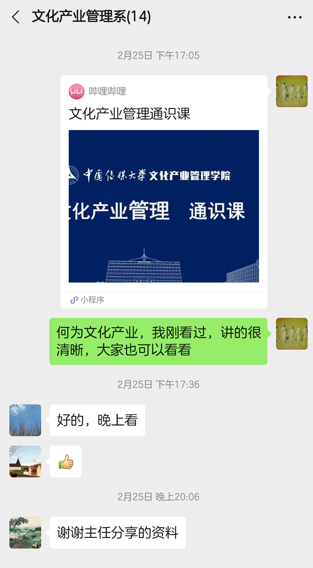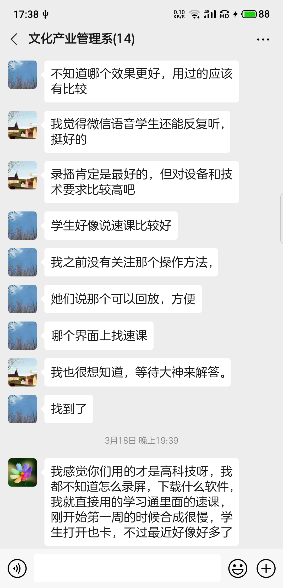 防疫期间,文化产业管理系微信群成员发展壮大,教学秘书等相关人员也被拉进群里,方便沟通。微信群不仅是工作群,也成了万能的朋友圈,各种通知,包括防疫通知及时在群里发布;有价值的信息及时在群里分享,大家在备课过程中看到好的网络课程资源,也会在群里交流,互通有无;老师有疑问的地方随时在群里咨询,成员群策群力进行解答,教研活动等也通过微信群线上开展,实现了防疫期间信息通畅,为各种活动的开展提供了平台保障。
