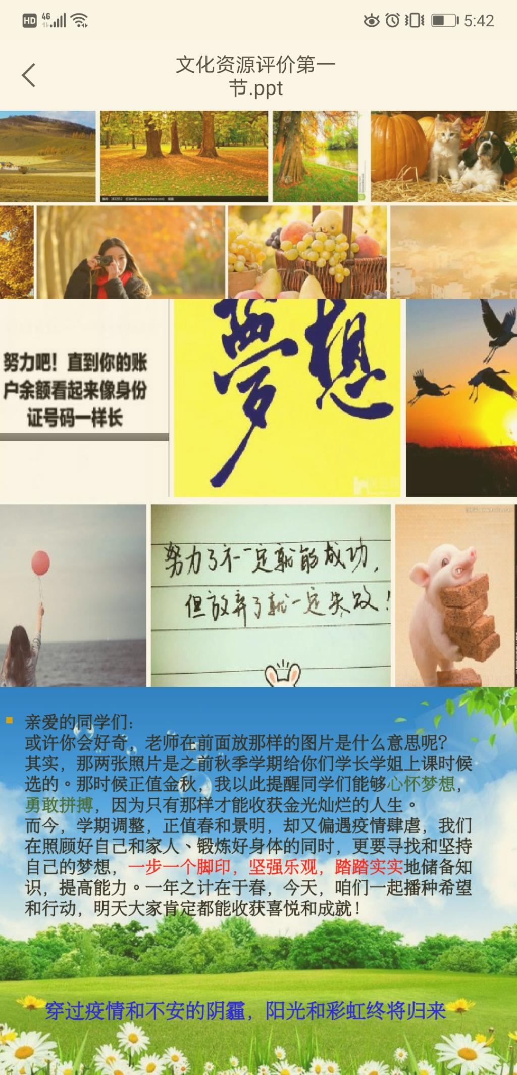 疫情期间,网络上不时传出关于网课的各种段子,调侃之余,也让人思考如何让员工以积极健康的心态接受网课,上好网课。为此,文管系的老师在网课第一课中首先做好员工的心理疏导,刘双老师的课程第一张PPT,是封短信,鼓励同学们“照顾好自己和家人,锻炼好身体的同时,更要寻找和坚持自己的梦想”,“穿过疫情和不安的阴霾,阳光和彩虹终将归来”;李海霞老师则直接把苏轼的词“万里归来颜愈少,微笑,笑时犹带岭梅香。试问岭南应不好,却道:此心安处是吾乡。”直接作为课程封面,希望同学们不管身在何处,都能保持良好的心态,每次上课之前,先整理心情,再进行学习。