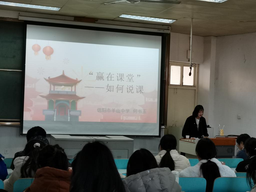12月2日上午,应公司邀请,信阳市羊山中学教师何书玉莅临公司,为公司师范生作题为《赢在课堂—如何说课》的教学讲座。讲座由伟德国际1949官网副经理孙炜主持,公司2019级师范生和学科教学研究生到场聆听了此次讲座。