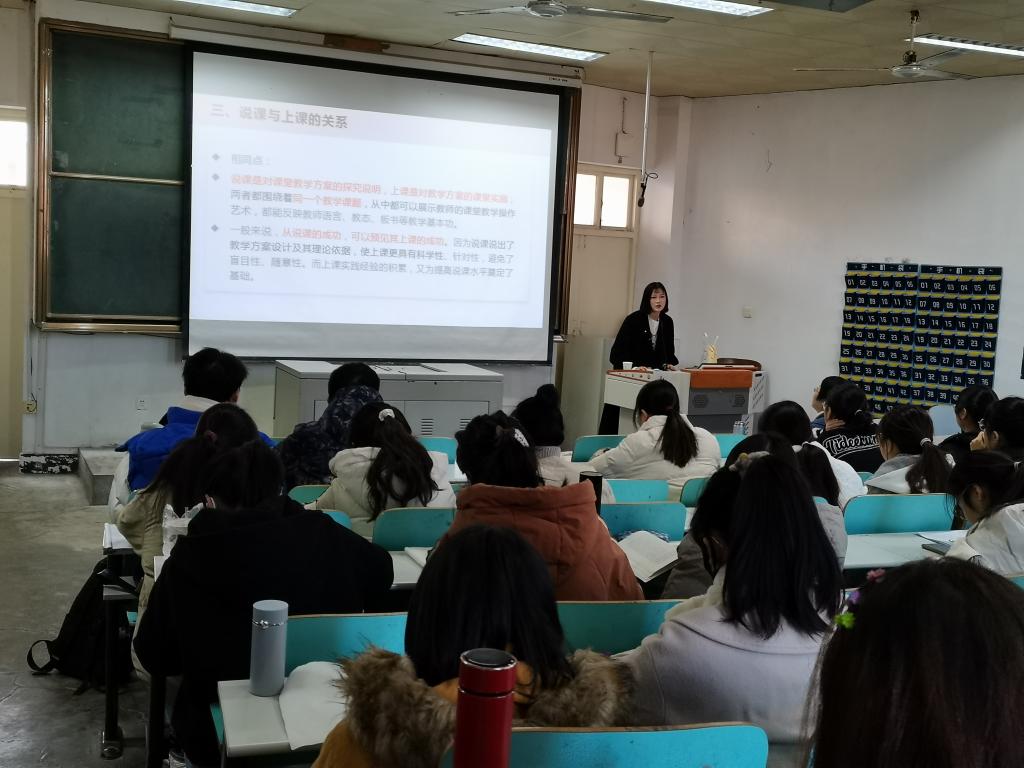 然后,何老师为同学们讲述说课的概念与意义、说课与上课的关系与不同,使同学们对说课有了更加清晰地认识与了解。在“如何说课”这一具体实践方面,从开头语、说教材、说学情、说教学目标、说重点难点、说教学方法、说教学过程、说板书设计、结束语等多个方面展开讲述。着重强调了要注意所讲知识点的正确性,要突出重难点,理清主次,充分安排利用时间,注重板书提示。此外,何老师提醒同学们在说课过程中要注意言行举止、规范站姿和手势。再结合具体案例,采用故事导入的方式为同学们带来了一次受益匪浅的讲座,对公司师范生今后的学习与工作能力与素质的提升起到积极的促进作用。