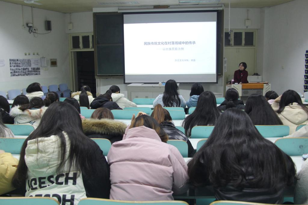 11月27日晚,公司姚磊老师在人文楼609教室作题为“民族传统文化在村落场域中的传承”的人文视野讲座,2018、2019级文化产业管理班全体员工到场听讲。