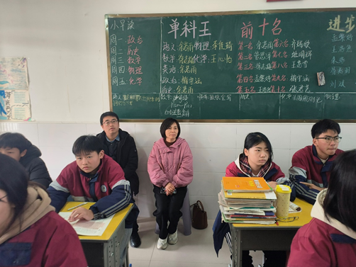 在息县第三初级中学,史经霞与项杰董事长进行座谈,了解了实习生的工作表现、生活环境等情况,感谢公司对实习研究生的支持与关爱。随后史经霞等到教室听取了实习生王浩坤的授课,对实习生的表现表示肯定。
