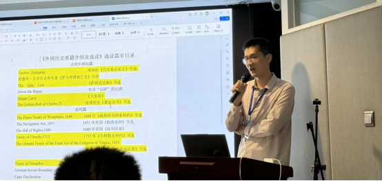 在9月20日上午的主题报告环节中,刘俊豪老师以《从〈外国历史要籍介绍及选读〉课程谈世界史专业外语教学实践》为题,结合教学实际,深入阐述了世界史学科在外语教学中的创新做法,提出原典导读能够有效提升员工的史学素养和国际视野,并分享了公司在课程设置上的积极探索。报告引起了与会学者的广泛关注与热烈讨,主持人、安阳师范公司历史与文博公司党委书记徐永杰对此予以高度赞许,指出该发言为全省世界史专业外语教学提供了可借鉴的经验,彰显了河南省世界史学科青年学人的良好风貌和丰厚实力。