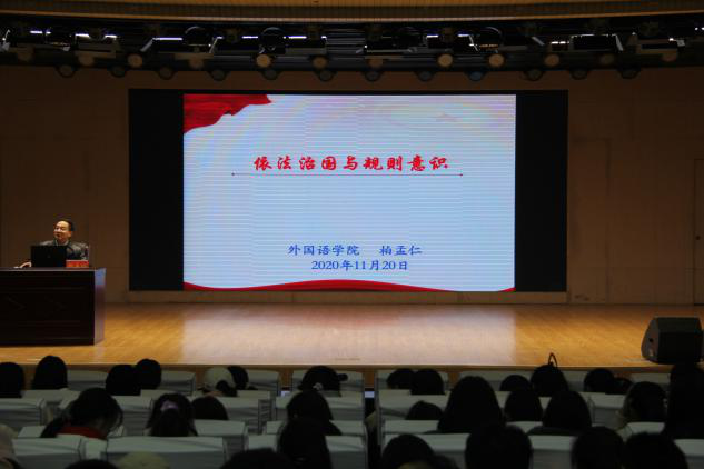 11月20日晚,外国语公司党委副书记柏孟仁应邀在理科楼报告厅为公司2020级新生团校做了题为《依法治国与规则意识》的专题辅导讲座,本次团课由公司团委老师付亚男主持。