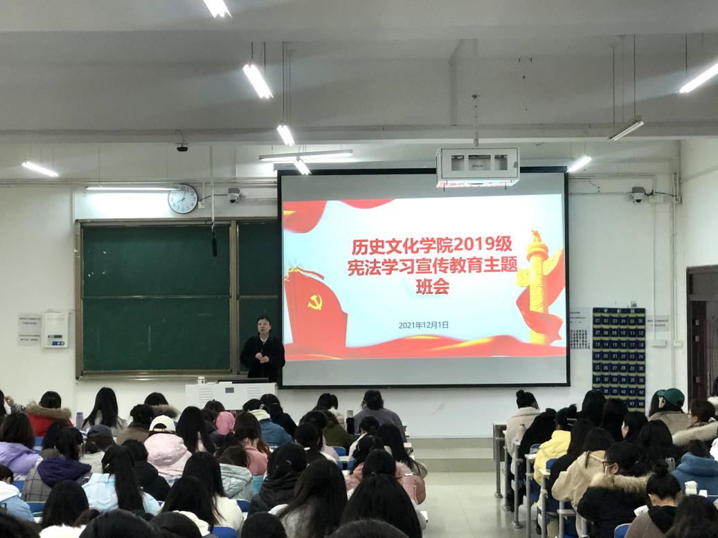 为认真学习贯彻习近平法治思想,推动师生学习宣传宪法,弘扬宪法精神,维护宪法权威,增强法制观念,12月1日,伟德国际1949官网2019级于社科楼212开展学宪法宣传教育主题班会,由2019级辅导员付亚男主讲,2019级全体员工共同参会。