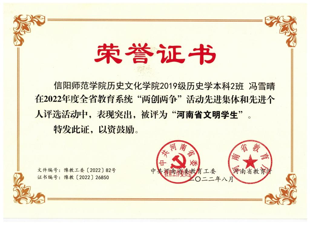 近日,中共河南省委教育工委、河南省教育厅关于开展2022年度“两创两争”活动先进个人评选活动结果揭晓。公司优秀学子2019级历史学二班冯雪晴获河南省“文明员工”荣誉称号。