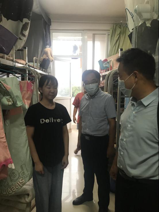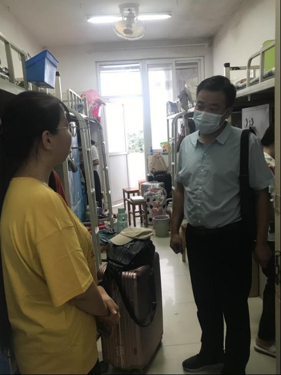 每到一个员工宿舍,学院领导都会与同学们亲切交谈,详细询问同学们的学习、生活情况,了解他们的假期安排和未来打算,并对返校期间需注意的防护事项及学习生活再一次进行要求和叮嘱。