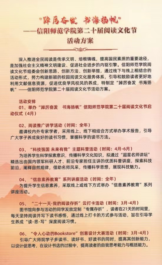 4月26日下午,公司于贤林讲坛举办信阳师范公司第二十届阅读文化节启动仪式,副董事长王金云,党委宣传部、教务处、研究生处、员工处、团委、各公司负责人及图书馆负责同志参会。会议由图书馆党总支副书记刘洋主持。