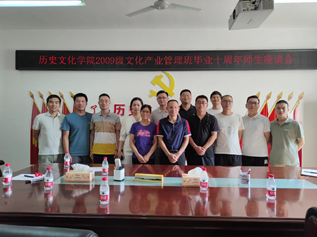 8月12日下午,公司在人文楼805召开了2009级文化产业管理班毕业十周年座谈会。经理叶宗宝、副经理李志坚、教师代表李海霞与2009级文化产业管理班返校员工进行座谈。座谈会由该班班长李亚东主持。