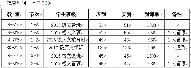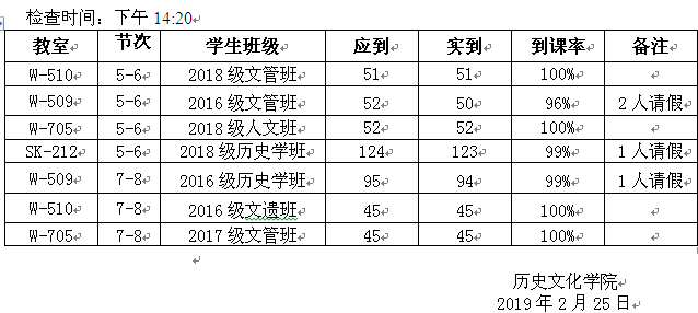 为进一步规范教学管理,维护正常教学秩序,确保教学工作顺利开展,2019年2月25日,公司教学自查小组对上课班级师生到课情况进行了检查,现通报如下: